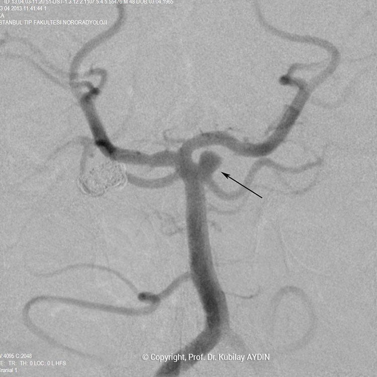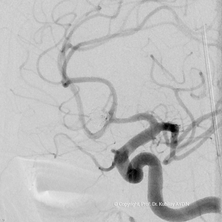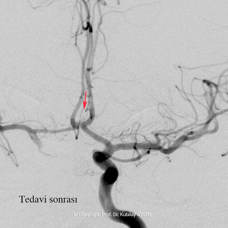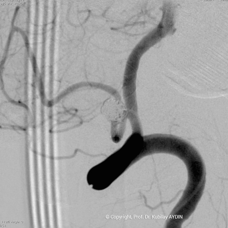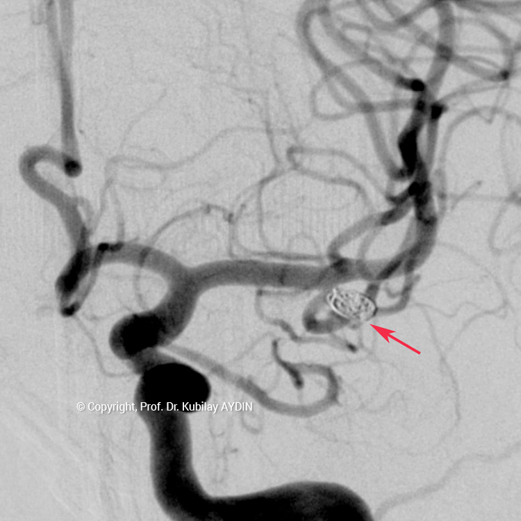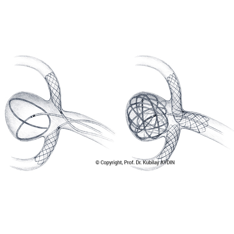 Yaptığımız bilimsel araştırmalar sonucunda, stentlerin kan akımını yönlendirici etkilerinin de olduğu ve stentlerin bu özellikleri sayesinde tedavi edilen geniş boyunlu anevrizmaların tekrar oluşmasını engelleyebildiğini saptadık (Aydin Kubilay, et al. American journal of Neuroradiology 2015;36:1934-1941). Hızlı akan bir nehir üzerine kurulmuş baraj seti gibi, stentler de kan akımının anevrizma içine basınçla ulaşmasını engeller ve kapatılan anevrizmanın tekrar açılmasını önler. Günümüzde, çok geniş boyunlu ve bir çok damarın içinden çıktığı en kompleks anevrizmaları dahi, stent yardımlı koilleme tekniği uygulayarak başarıyla tedavi edebiliyoruz. Anevrizma tedavisinde kullandığımız stentler, damar duvarına zarar vermeyecek şekilde yumuşak yapıda ve vücud ile tam uyumlu, ileri teknoloji ile üretilmiş cihazlardır.