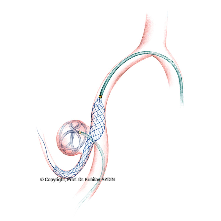 Geniş boyunlu anevrizmaların stent kullanılarak koillerle kapatılması işlemine “stent-yardımlı koilleme” adını veriyoruz. Bu işlemin ilk aşamasında anevrizmanın boynunu örtecek şekilde damar içine bir metal kafes (stent) yerleştirilerek, bir sonraki aşamada anevrizma kesesi içine konulan koillerin damar içine sarkması önlenir. Yani, burada stentin görevi, anevrizma içine doldurduğumuz koil adı verilen tellerin, damar içine sarkmasını önlemektir. Stent-yardımlı koilleme, geniş boyunlu anevrizmaların kapalı yöntemle tedavisinde tercih edilen bir yöntemdir.